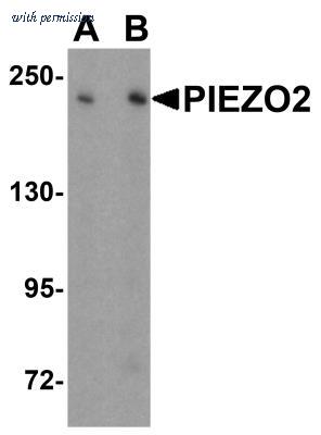 Western Blot: PIEZO2 Antibody [NBP2-61130] - Analysis of PIEZO2 in SK-N-SH cell lysate with PIEZO2 antibody at (A) 1 and (B) 2 ug/mL.