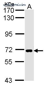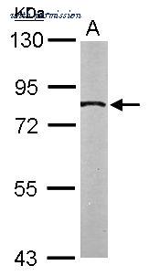 Western Blot analysis of SLC20A1 using anti-SLC20A1 Polyclonal Antibody (PA5-28182), in H1299 Cell Lysate (30 ug of cell lysate) and at a dilution of 1:1000.