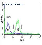 Flow cytometric analysis of MCF-7 cells (right histogram) compared to a negative control cell (left histogram). FITC-conjugated goat-anti-rabbit secondary antibodies were used for the analysis.