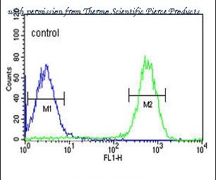 Flow cytometric analysis of HepG2 cells (right histogram) compared to a negative control cell (left histogram). FITC-conjugated goat-anti-rabbit secondary antibodies were used for the analysis.
