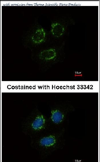 Immunofluorescence analysis of methanol-fixed MCF-7 cells using TTLL10 (PA5-31631) antibody at 1:500 dilution.