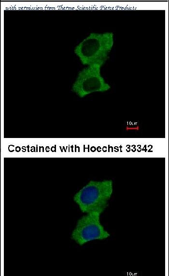 Immunofluorescence analysis of methanol-fixed A431 cells using ZNF598 (PA5-31409) antibody at 1:500 dilution.