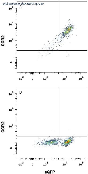 Detection of CCR2 antibody in HEK293 Human Cell Line Transfected with Rat CCR2 and eGFP antibody by Flow Cytometry.