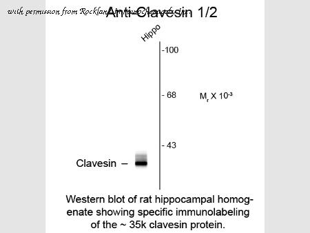 Western Blot of Anti-Clavesin (Rabbit) Antibody. Lane 1: rat hippocampal homogenate. Lane 2: none. Load: 10 µg per lane. Primary antibody: Clavesin antibody at 1:400 for overnight at 4°C. Secondary antibody: IRDye800™ rabbit secondary antibody at 1:10,000 for 45 min at RT. Block: 5% BLOTTO overnight at 4°C. Predicted/Observed size: ~ 35kDa/~kDa for clavesin protein. Other band(s): none.