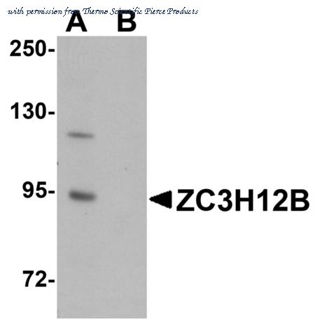 Western blot analysis of mouse brain tissue lysate using PA5-20927 anti-ZC3H12B antibody at 1 ug/mL in (A) the absence and (B) the presence of blocking peptide.