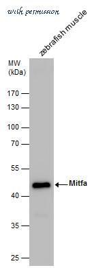 Mitfa antibody detects Mitfa protein by western blot analysis. Zebrafish tissue extracts (30 ?g) was separated by 10 % SDS-PAGE, and the membrane was blotted with Mitfa antibody (GTX128263) at a dilution of 1:1000.