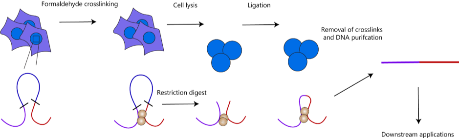 The first of the C-technologies to be established was termed 3C [82]. 3C relies on the detection of ligation products by PCR followed by gel electrophoresis, or quantitative PCR (qPCR). Contacts within specific regions are investigated using locus-specific primers that recognize the restriction fragments of interest. Therefore, it is a candidate-based approach, usually used to assay the interaction between a pair of sequences, for example between a promoter and upstream regulatory elements [83] To carry out this experiment, cells are crosslinked with formaldehyde and lysed to release their nuclei. The nuclei are subject to digestion with a restriction enzyme of choice. The digested fragments are then ligated, de-crosslinked and purified. The DNA undergoes quality control checks and is then ready for analysis. Most of the derivatives of the C-technologies have these key steps in common [84].