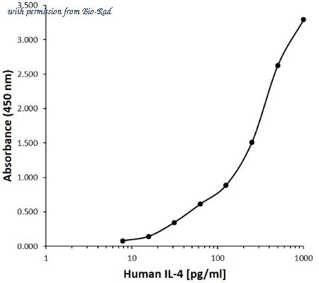 Sandwich ELISA analysis of human interleukin-4 using Mouse anti Human interleukin-4 ( MCA6240GA ) as a capture reagent and biotinylated Mouse anti Human interleukin-4 ( MCA6241B ) as a detection reagent with purified recombinant interleukin-4 as the antigen. Detection was performed using HRP conjugated streptavidin and substrate.