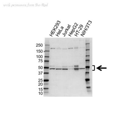 Western blot analysis of whole cell lysates probed with IRF3 antibody followed by detection with Goat anti Rabbit HRP conjugated (1/10,000, STAR208P ) and visualized on the ChemiDoc MP with 37 second exposure. Arrow points to IRF3 (molecular weight 45-55 kDa)