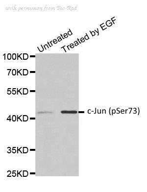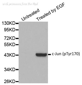 Western blot analysis of extracts from HeLa cells untreated or treated with EGF using Rabbit anti c-Jun (pTyr170) antibody. Cells were cultured in serum free media for 16-20 hours before treatment with EGF (100ng/ml) for 30 minutes