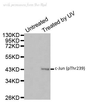 Western blot analysis of extracts from HeLa cells untreated or treated with UV (for 15-30 minutes) using Rabbit anti c-Jun (pThr239) antibody