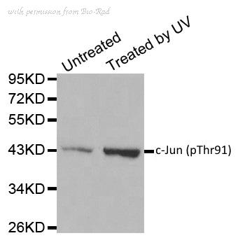 Western blot analysis of extracts from HEK-293 cells untreated or treated with UV (for 15-30 minutes) using Rabbit anti c-Jun (pThr91) antibody