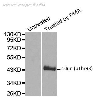Western blot analysis of extracts from HeLa cells untreated or treated with PMA using Rabbit anti c-Jun (pThr93) antibody. Cells were cultured in serum free media for 16-20 hours before treatment with PMA (200 nM) for 30 minutes