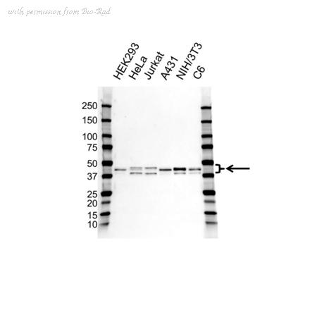 Western blot analysis of whole cell lysates probed with c-Jun antibody followed by detection with Goat anti Mouse HRP conjugated (1/10,000, STAR207P ) and visualized on the ChemiDoc MP with 37 second exposure. Arrow points to c-Jun (molecular weight 43 & 48 kDa)