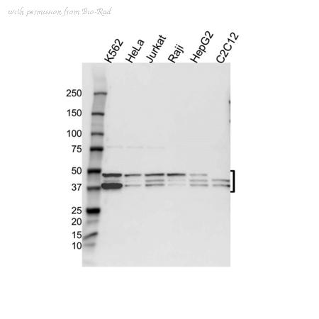 Western blot analysis of whole cell lysates probed with MAPK1 antibody followed by detection with Goat anti Rabbit HRP conjugated (1/10,000, STAR208P ) and visualized on the ChemiDoc MP with 13 second exposure. Arrow points to MAPK1 (molecular weight 42 & 44 kDa)