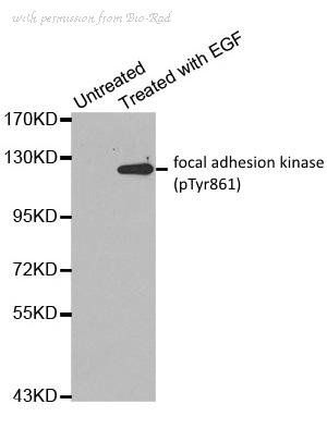 Western blot analysis of extracts from HT-29 cells untreated or treated with EGF using Rabbit anti focal adhesion kinase (pTyr861) antibody ( AHP2616 ). Cells were cultured in serum free media for 16-20 hours before treatment with EGF (100ng/ml) for 30 minutes