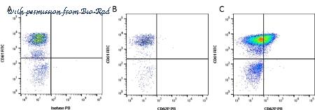 Figure A. FITC conjugated Mouse anti Human CD61 ( MCA2588F ) and Pacific Blue conjugated Mouse IgG1 isotype control ( MCA928PB ). Figure B and C. FITC conjugated Mouse anti Human CD61 ( MCA2588F ) and Pacific Blue conjugated Mouse anti Human CD62P ( MCA2418PB ). All experiments performed on Human blood gated on single platelets, in the presence of 10% human serum. Platelets in Figure C were thrombin activated. Data acquired on the ZE5 Cell Analyzer