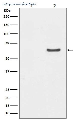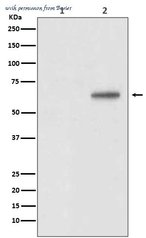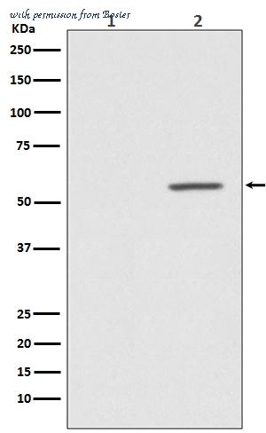 Western blot analysis of Phospho-AKT1 (S129) expression in (1) MCF-7 cell lysate treated with Alkaline Phosphatase; (2) MCF-7 cell lysate (P00024-3). Electrophoresis was performed on a 5-20% SDS-PAGE gel at 70V (Stacking gel) / 90V (Resolving gel) for 2-3 hours. The sample well of each lane was loaded with 50ug of sample under reducing conditions. After Electrophoresis, proteins were transferred to a Nitrocellulose membrane at 150mA for 50-90 minutes. Blocked the membrane with 5% Non-fat Milk/ TBS for 1.5 hour at RT. The membrane was incubated with rabbit anti-AKT1 monoclonal antibody (Catalog # P00024-3) overnight at 4 , then washed with TBS-0.1%Tween 3 times with 5 minutes each and probed with a goat anti-rabbit IgG-HRP secondary antibody at a dilution of 1:10000 for 1.5 hour at RT. The signal is developed using an Enhanced Chemiluminescent detection (ECL) kit (Catalog # EK1002) with Tanon 5200 system. A specific band was detected for AKT1