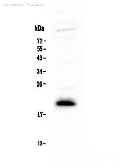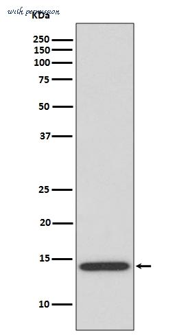 Figure. Western blot analysis of IL-4 using anti- IL-4 antibody (RP1009). Electrophoresis was performed on a 5-20% SDS-PAGE gel at 70V (Stacking gel) / 90V (Resolving gel) for 2-3 hours. The sample well of each lane was loaded with 50ug of sample under reducing conditions. Lane: Recombinant Human IL-4 Protein 0.5ng,. After Electrophoresis, proteins were transferred to a Nitrocellulose membrane at 150mA for 50-90 minutes. Blocked the membrane with 5% Non-fat Milk/ TBS for 1.5 hour at RT. The membrane was incubated with rabbit anti- IL-4 antigen affinity purified polyclonal antibody (Catalog # RP1009) at 0.5 ug/mL overnight at 4°C, then washed with TBS-0.1%Tween 3 times with 5 minutes each and probed with a goat anti-rabbit IgG-HRP secondary antibody at a dilution of 1:10000 for 1.5 hour at RT. The signal is developed using an Enhanced Chemiluminescent detection (ECL) kit (Catalog # EK1002) with Tanon 5200 system. A specific band was detected for IL-4 at approximately 14KD. The expected band size for IL-4 is at 14KD.