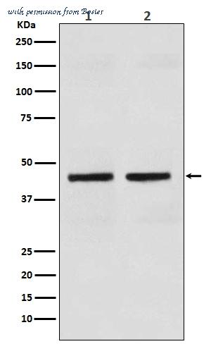 Western blot analysis of Cytokeratin 18 expression in (1) HT-29 cell lysate;(2) human kidney lysate (M01357-1). Electrophoresis was performed on a 5-20% SDS-PAGE gel at 70V (Stacking gel) / 90V (Resolving gel) for 2-3 hours. The sample well of each lane was loaded with 50ug of sample under reducing conditions. After Electrophoresis, proteins were transferred to a Nitrocellulose membrane at 150mA for 50-90 minutes. Blocked the membrane with 5% Non-fat Milk/ TBS for 1.5 hour at RT. The membrane was incubated with rabbit anti-KRT18 monoclonal antibody (Catalog # M01357-1) overnight at 4 C, then washed with TBS-0.1%Tween 3 times with 5 minutes each and probed with a goat anti-rabbit IgG-HRP secondary antibody at a dilution of 1:10000 for 1.5 hour at RT. The signal is developed using an Enhanced Chemiluminescent detection (ECL) kit (Catalog # EK1002) with Tanon 5200 system. A specific band was detected for KRT18