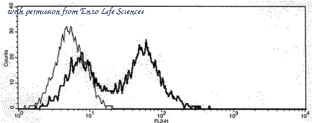 Method: HEK 293T cells were mock transfected (thin line) or transfected with an expression plasmid enabling surface expression of the extracellular domain of mouse BAFF (thick line). Cells (5 x 105) were incubated on ice for 30 min in 50µl FACS buffer (PBS, 5% fetal calf serum, 0.02% sodium azide) containing 1µg/ml of MAb to BAFF (mouse) (1C9). After washing in FACS buffer, R-PE-conjugated antibody to rat IgG (Prod. No. ALX-211-053) was added. Cells were incubated on ice for 30 min, washed and then analyzed by flow cytometry.