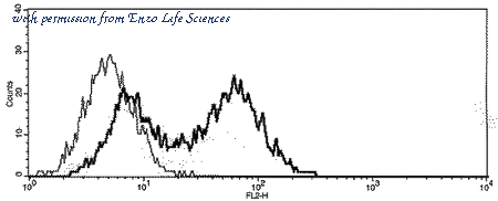 Method: HEK 293T cells were mock transfected (thin line) or transfected with an expression plasmid enabling surface expression of the extracellular domain of mouse BAFF (thick line). Cells (5 x 105) were incubated on ice for 30 min in 50µl FACS buffer (PBS, 5% fetal calf serum, 0.02% sodium azide) containing 1µg/ml of MAb to BAFF (mouse) (5A8). After washing in FACS buffer, R-PE-conjugated antibody to rat IgG (Prod. No. ALX-211-053) was added. Cells were incubated on ice for 30 min, washed and then analyzed by flow cytometry.