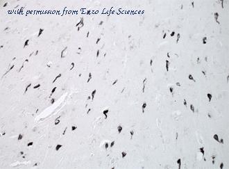 Immunohistochemistry analysis of p62 immunoreactivity is present in neurons of the hippocampus of an Alzheimer patient. Note the intense reaction in the neurofibrillary tangles (dilution 1:1000).