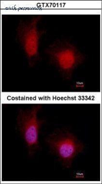 Immunofluorescence analysis of paraformaldehyde-fixed HeLa, using BRCA1(GTX70117) antibody at 1:100 dilution.