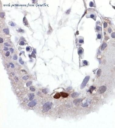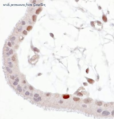 Immunohistochemistry staining of Wild-type p53 expressed in human trophoblast (paraffin-embedded sections). Note that some of total p53 positive nuclei are also FP3.2 (phospho p53) positive. 1A – anti-p53(GTX75422) (total)