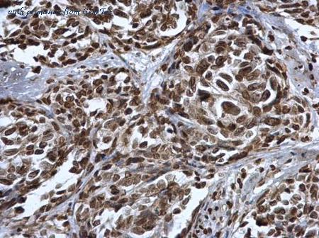 p53 (mono-methyl Lys372) antibody detects p53 (mono-methyl Lys372) protein at cytoplasm and nucleus in human cervical cancer by immunohistochemical analysis. Sample: Paraffin-embedded human cervical cancer. p53 (mono-methyl Lys372) antibody (GTX117515) diluted at 1:500.