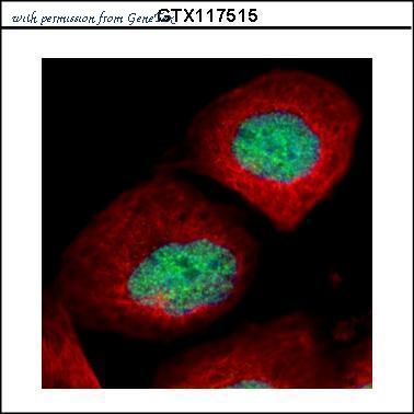 Confocal immunofluorescence analysis (Olympus FV10i) of paraformaldehyde-fixed U2OS, using p53 (mono-methyl Lys372)(GTX117515) antibody (Green) at 1:500 dilution. Alpha-tubulin filaments were labeled with GTX11304 (Red) at 1:2000.