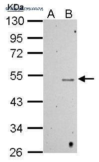 Sample (30 ug of whole cell lysate) A: HCT116 cells with mock treatment for 24hr B: HCT116 cells with 30uM cisplatin treatment for 24hr 10% SDS PAGE GTX117515 diluted at 1:500