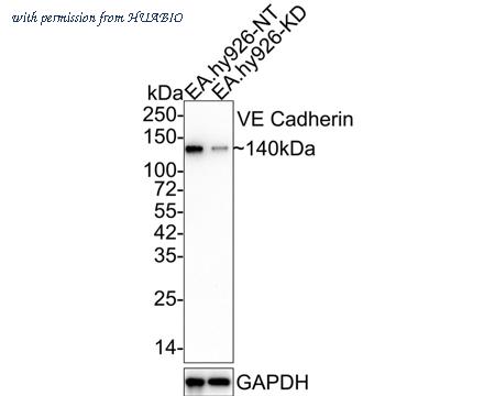 Western blot analysis of VE Cadherin on different lysates with Rabbit anti-VE Cadherin antibody (HA750856) at 1/2,000 dilution. Lane 1: EA.hy926-si NT cell lysate Lane 2: EA.hy926-si VE Cadherin cell lysate Lysates/proteins at 10 µg/Lane. Predicted band size: 88 kDa Observed band size: 140 kDa Exposure time: 1 minute 2 seconds; 4-20% SDS-PAGE gel. Proteins were transferred to a PVDF membrane and blocked with 5% NFDM/TBST for 1 hour at room temperature. The primary antibody (HA750856) at 1/2,000 dilution was used in 5% NFDM/TBST at 4℃ overnight. Goat Anti-Rabbit IgG - HRP Secondary Antibody (HA1001) at 1/50,000 dilution was used for 1 hour at room temperature.