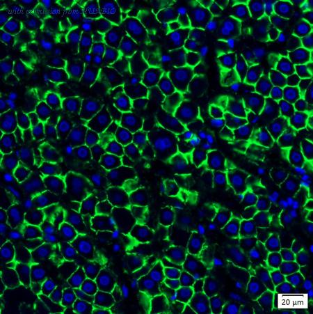 mIHC analysis of human liver tissue (Formalin/PFA-fixed paraffin-embedded sections) with Mouse anti-Pan-Cadherin antibody (IRS285MS) at 1/100 dilution. The immunostaining was performed with the IRISKitCmTSA Kit (900809). Heat mediated antigen retrieval with Tris-EDTA buffer (pH 9.0) for 30 mins at 95℃. DAPI (blue) was used as a nuclear counter stain. Image acquisition was performed with Olympus VS200 Slide Scanner.