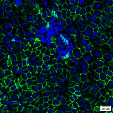mIHC analysis of human liver tissue (Formalin/PFA-fixed paraffin-embedded sections) with Rat anti-Pan-Cadherin antibody (IRS287RT) at 1/100 dilution. The immunostaining was performed with the IRISKitCmTSA Kit (900810). Heat mediated antigen retrieval with Tris-EDTA buffer (pH 9.0) for 30 mins at 95℃. DAPI (blue) was used as a nuclear counter stain. Image acquisition was performed with Olympus VS200 Slide Scanner.