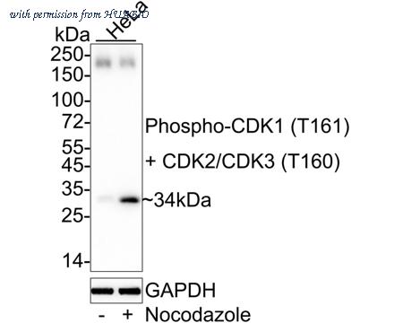 Western blot analysis of Phospho-CDK1 (T161) + CDK2/CDK3 (T160) on different lysates with Rabbit anti-Phospho-CDK1 (T161) + CDK2/CDK3 (T160) antibody (HA722582) at 1/1,000 dilution. Lane 1: HeLa cell lysate Lane 2: HeLa treated with 100ng/mL Nocodazole for 18 hours cell lysate Lysates/proteins at 20 µg/Lane. Predicted band size: 34 kDa Observed band size: 34 kDa Exposure time: 25 seconds; ECL: K1801; 4-20% SDS-PAGE gel. Proteins were transferred to a PVDF membrane and blocked with 5% NFDM/TBST for 1 hour at room temperature. The primary antibody (HA722582) at 1/1,000 dilution was used in 5% NFDM/TBST at 4℃ overnight. Goat Anti-Rabbit IgG - HRP Secondary Antibody (HA1001) at 1/50,000 dilution was used for 1 hour at room temperature.