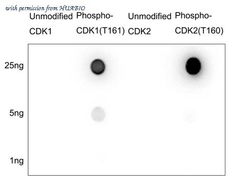 Dot blot analysis of Phospho-CDK1 (T161) + CDK2/CDK3 (T160) on different proteins with Rabbit anti-Phospho-CDK1 (T161) + CDK2/CDK3 (T160) antibody (HA722582) at 1/1,000 dilution. Goat Anti-Rabbit IgG - HRP Secondary Antibody (HA1001) at 1/50,000 dilution for 1 hour at room temperature. Lane 1: Unmodified CDK1 (negative) Lane 2: Phospho-CDK1(T161) (positive) Lane 3: Unmodified CDK2 (negative) Lane 4: Phospho-CDK2(T160) (positive) Proteins loading: 25ng, 5ng, 1ng; Blocking and dilution buffer: 5% NFDM/TBST; Exposure time: 1 minute; ECL: K1801.