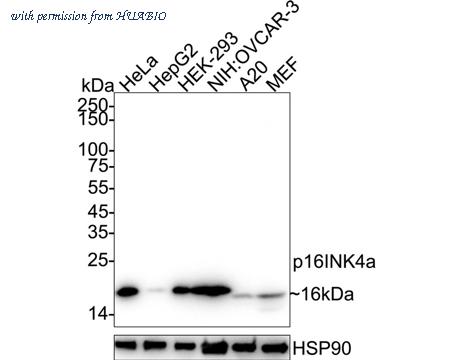 Western blot analysis of p16INK4a on different lysates with Rabbit anti-p16INK4a antibody (ER2001-30) at 1/5,000 dilution. Lane 1: HeLa cell lysate Lane 2: HepG2 cell lysate Lane 3: HEK-293 cell lysate Lane 4: NIH:OVCAR-3 cell lysate Lane 5: A20 cell lysate Lane 6: MEF cell lysate Lysates/proteins at 20 µg/Lane. Predicted band size: 16 kDa Observed band size: 16 kDa Exposure time: 10 seconds; ECL: K1801; 4-20% SDS-PAGE gel. Proteins were transferred to a PVDF membrane and blocked with 5% NFDM/TBST for 1 hour at room temperature. The primary antibody (ER2001-30) at 1/5,000 dilution was used in primary antibody dilution (K1803) at 4℃ overnight. Goat Anti-Rabbit IgG - HRP Secondary Antibody (HA1001) at 1/50,000 dilution was used for 1 hour at room temperature.