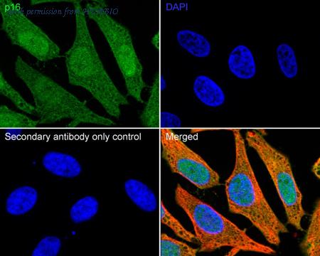 Immunocytochemistry analysis of HeLa cells labeling p16INK4a with Rabbit anti-p16INK4a antibody (ER2001-30) at 1/5,000 dilution. Cells were fixed in 4% paraformaldehyde for 15 minutes at room temperature, permeabilized with 0.1% Triton X-100 in PBS for 15 minutes at room temperature, then blocked with 1% BSA in 10% negative goat serum for 1 hour at room temperature. Cells were then incubated with Rabbit anti-p16INK4a antibody (ER2001-30) at 1/5,000 dilution in 1% BSA in PBST overnight at 4 ℃. Goat Anti-Rabbit IgG H&L (iFluor™ 488, HA1121) was used as the secondary antibody at 1/1,000 dilution. PBS instead of the primary antibody was used as the secondary antibody only control. Nuclear DNA was labelled in blue with DAPI. Beta tubulin (HA601187, red) was stained at 1/100 dilution overnight at +4℃. Goat Anti-Mouse IgG H&L (iFluor™ 594, HA1126) was used as the secondary antibody at 1/1,000 dilution.