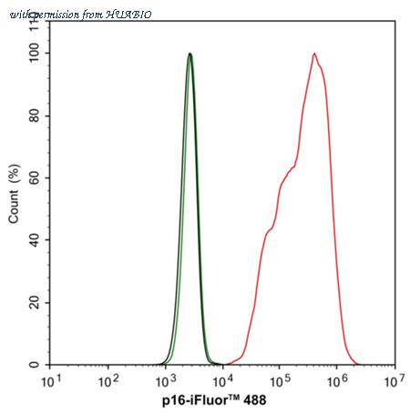 Flow cytometric analysis of HeLa cells labeling p16INK4a. Cells were fixed and permeabilized. Then stained with the primary antibody (ER2001-30, 1/1,000) (red) compared with Rabbit IgG Isotype Control (green). After incubation of the primary antibody at +4℃ for an hour, the cells were stained with a iFluor™ 488 conjugate-Goat anti-Rabbit IgG Secondary antibody (HA1121) at 1/1,000 dilution for 30 minutes at +4℃. Unlabelled sample was used as a control (cells without incubation with primary antibody; black).