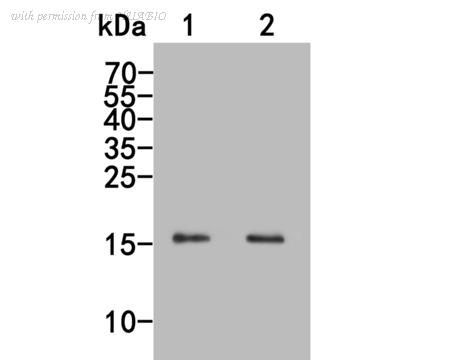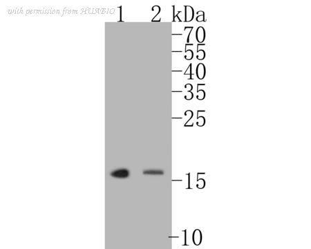 Western blot analysis of p16INK4a on different lysates with Rabbit anti-p16INK4a antibody (ET1608-62) at 1/1,000 dilution. Lane 1: HeLa-si NT cell lysate Lane 2: HeLa-si p16INK4a cell lysate Lysates/proteins at 15 µg/Lane. Predicted band size: 16 kDa Observed band size: 16 kDa Exposure time: 20 seconds; 4-20% SDS-PAGE gel. Proteins were transferred to a PVDF membrane and blocked with 5% NFDM/TBST for 1 hour at room temperature. The primary antibody (ET1608-62) at 1/1,000 dilution was used in 5% NFDM/TBST at 4℃ overnight. Goat Anti-Rabbit IgG - HRP Secondary Antibody (HA1001) at 1/100,000 dilution was used for 1 hour at room temperature.