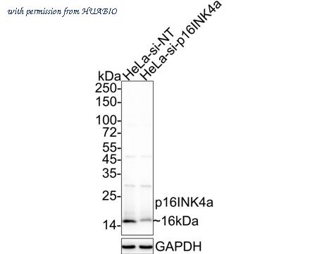 Western blot analysis of p16INK4a on different lysates with Rabbit anti-p16INK4a antibody (HA750158) at 1/1,000 dilution. Lane 1: HeLa-si NT cell lysate Lane 2: HeLa-si p16INK4a cell lysate Lysates/proteins at 15 µg/Lane. Predicted band size: 16 kDa Observed band size: 16 kDa Exposure time: 20 seconds; 4-20% SDS-PAGE gel. Proteins were transferred to a PVDF membrane and blocked with 5% NFDM/TBST for 1 hour at room temperature. The primary antibody (HA750158) at 1/1,000 dilution was used in 5% NFDM/TBST at 4℃ overnight. Goat Anti-Rabbit IgG - HRP Secondary Antibody (HA1001) at 1/100,000 dilution was used for 1 hour at room temperature.