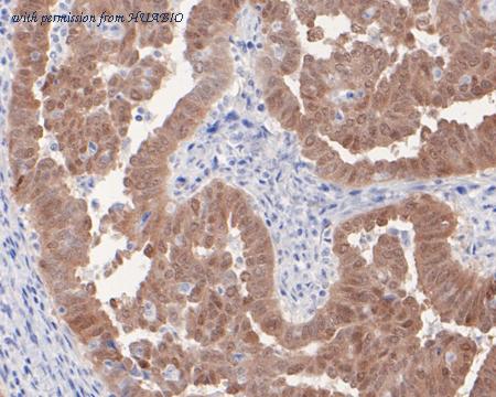 Immunohistochemical analysis of paraffin-embedded human ovarian serous carcinoma tissue using anti-p16INK4a antibody. The section was pre-treated using heat mediated antigen retrieval with sodium citrate buffer (pH 6.0) (high pressure) for 2 minutes. The tissues were blocked in 5% BSA for 30 minutes at room temperature, washed with ddH2O and PBS, and then probed with the primary antibody (HA600026, 1/400) for 30 minutes at room temperature. The detection was performed using an HRP conjugated compact polymer system. DAB was used as the chromogen. Tissues were counterstained with hematoxylin and mounted with DPX.