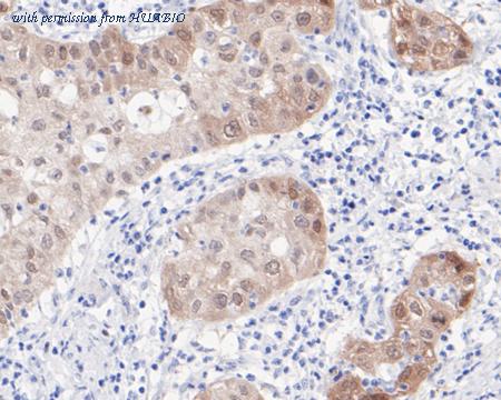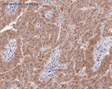 Immunohistochemical analysis of paraffin-embedded human cervix poorly differentiated adenocarcinoma tissue with Mouse anti-p16INK4a antibody (HA601131) at 1/500 dilution. The section was pre-treated using heat mediated antigen retrieval with sodium citrate buffer (pH 6.0) (high pressure) for 2 minutes. The tissues were blocked in 1% BSA for 20 minutes at room temperature, washed with ddH2O and PBS, and then probed with the primary antibody (HA601131) at 1/500 dilution for 1 hour at room temperature. The detection was performed using an HRP conjugated compact polymer system. DAB was used as the chromogen. Tissues were counterstained with hematoxylin and mounted with DPX.