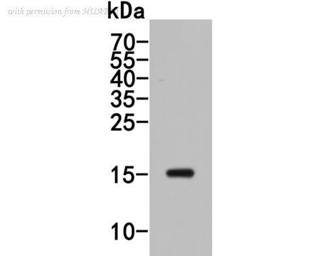Western blot analysis of p16INK4a on Hela cell lysate. Proteins were transferred to a PVDF membrane and blocked with 5% BSA in PBS for 1 hour at room temperature. The primary antibody (HA600027, 1/500) was used in 5% BSA at room temperature for 2 hours. Goat Anti-Mouse IgG - HRP Secondary Antibody (HA1006) at 1:5,000 dilution was used for 1 hour at room temperature.