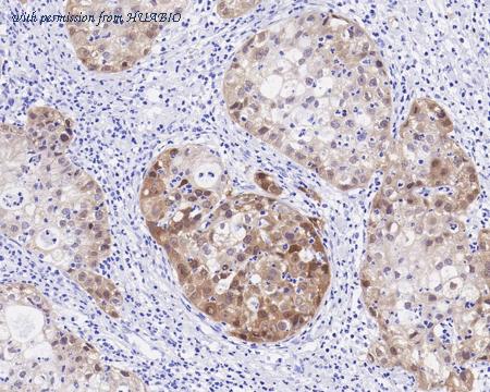 Immunohistochemical analysis of paraffin-embedded human ovary carcinoma tissue with Rabbit anti-p16INK4a antibody (HA721415) at 1/1,000 dilution. The section was pre-treated using heat mediated antigen retrieval with sodium citrate buffer (pH 6.0) (high pressure) for 2 minutes. The tissues were blocked in 1% BSA for 20 minutes at room temperature, washed with ddH2O and PBS, and then probed with the primary antibody (HA721415) at 1/1,000 dilution for 1 hour at room temperature. The detection was performed using an HRP conjugated compact polymer system. DAB was used as the chromogen. Tissues were counterstained with hematoxylin and mounted with DPX.