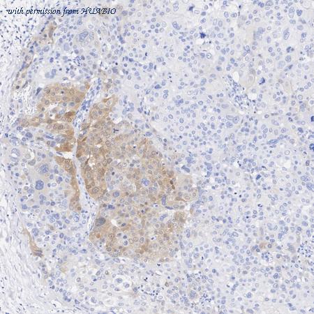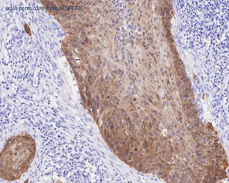 Immunohistochemical analysis of paraffin-embedded human cervix highly differentiated squamous cell carcinoma tissue with Mouse anti-p16INK4a antibody (HA601131) at 1/200 dilution. The section was pre-treated using heat mediated antigen retrieval with sodium citrate buffer (pH 6.0) (high pressure) for 2 minutes. The tissues were blocked in 1% BSA for 20 minutes at room temperature, washed with ddH2O and PBS, and then probed with the primary antibody (HA601131) at 1/200 dilution for 1 hour at room temperature. The detection was performed using an HRP conjugated compact polymer system. DAB was used as the chromogen. Tissues were counterstained with hematoxylin and mounted with DPX.
