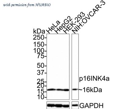 Western blot analysis of p16INK4a on different lysates with Rabbit anti-p16INK4a antibody (HA721415) at 1/1,000 dilution. Lane 1: HeLa cell lysate (20 µg/Lane) Lane 2: HepG2 cell lysate (20 µg/Lane) Lane 3: HEK-293 cell lysate (20 µg/Lane) Lane 4: NIH:OVCAR-3 cell lysate (20 µg/Lane) Predicted band size: 16 kDa Observed band size: 16 kDa Exposure time: 2 minutes; ECL: K1801; 4-20% SDS-PAGE gel. Proteins were transferred to a PVDF membrane and blocked with 5% NFDM/TBST for 1 hour at room temperature. The primary antibody (HA721415) at 1/1,000 dilution was used in 5% NFDM/TBST at room temperature for 2 hours. Goat Anti-Rabbit IgG - HRP Secondary Antibody (HA1001) at 1/100,000 dilution was used for 1 hour at room temperature.