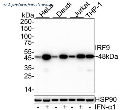 Western blot analysis of IRF9 on different lysates with Rabbit anti-IRF9 antibody (HA751211) at 1/1,000 dilution. Lane 1: HeLa cell lysate Lane 2: HeLa treated with 10ng/mL IFN-α1 for 16 hours cell lysate Lane 3: Daudi cell lysate Lane 4: Daudi treated with 10ng/mL IFN-α1 for 16 hours cell lysate Lane 5: Jurkat cell lysate Lane 6: Jurkat treated with 100nM IFN-α1 for 24 hours cell lysate Lane 7: THP-1 cell lysate Lysates/proteins at 20 µg/Lane. Predicted band size: 44 kDa Observed band size: 48 kDa Exposure time: 46 seconds; ECL: K1801; 4-20% SDS-PAGE gel. Proteins were transferred to a PVDF membrane and blocked with 5% NFDM/TBST for 1 hour at room temperature. The primary antibody (HA751211) at 1/1,000 dilution was used in 5% NFDM/TBST at 4℃ overnight. Goat Anti-Rabbit IgG - HRP Secondary Antibody (HA1001) at 1/50,000 dilution was used for 1 hour at room temperature.