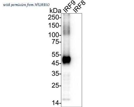 Western blot analysis of IRF9 on different lysates with Rabbit anti-IRF9 antibody (HA722963) at 1/1,000 dilution. Lane 1: Human IRF9 recombinant protein, 30ng/Lane Lane 2: Human IRF8 recombinant protein, 30ng/Lane Exposure time: 5 seconds; ECL: K1801; 4-20% SDS-PAGE gel. Proteins were transferred to a PVDF membrane and blocked with 5% NFDM/TBST for 1 hour at room temperature. The primary antibody (HA722963) at 1/1,000 dilution was used in 5% NFDM/TBST at room temperature for 2 hours. Goat Anti-Rabbit IgG - HRP Secondary Antibody (HA1001) at 1/50,000 dilution was used for 1 hour at room temperature.